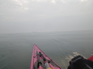 A further hour of paddling before the sun rose and as the light improved it became obvious why it had been so dark – visibility was probably only about a mile. As the day grew brighter the view turned a rather milky grey; it crossed my mind that it was like looking out of a rather dirty milk bottle, with the milk still in it. I guessed the sun was coming up, though I never did see it!